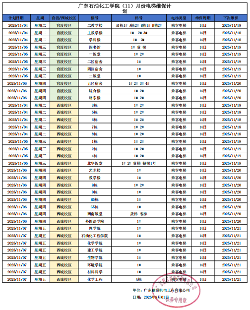 为保障学校电梯安全正常运行,电梯维保公司将例行对全校电梯进行维保。现公布2025年10、11月全校电梯维保工作计划,详见下图及附件: