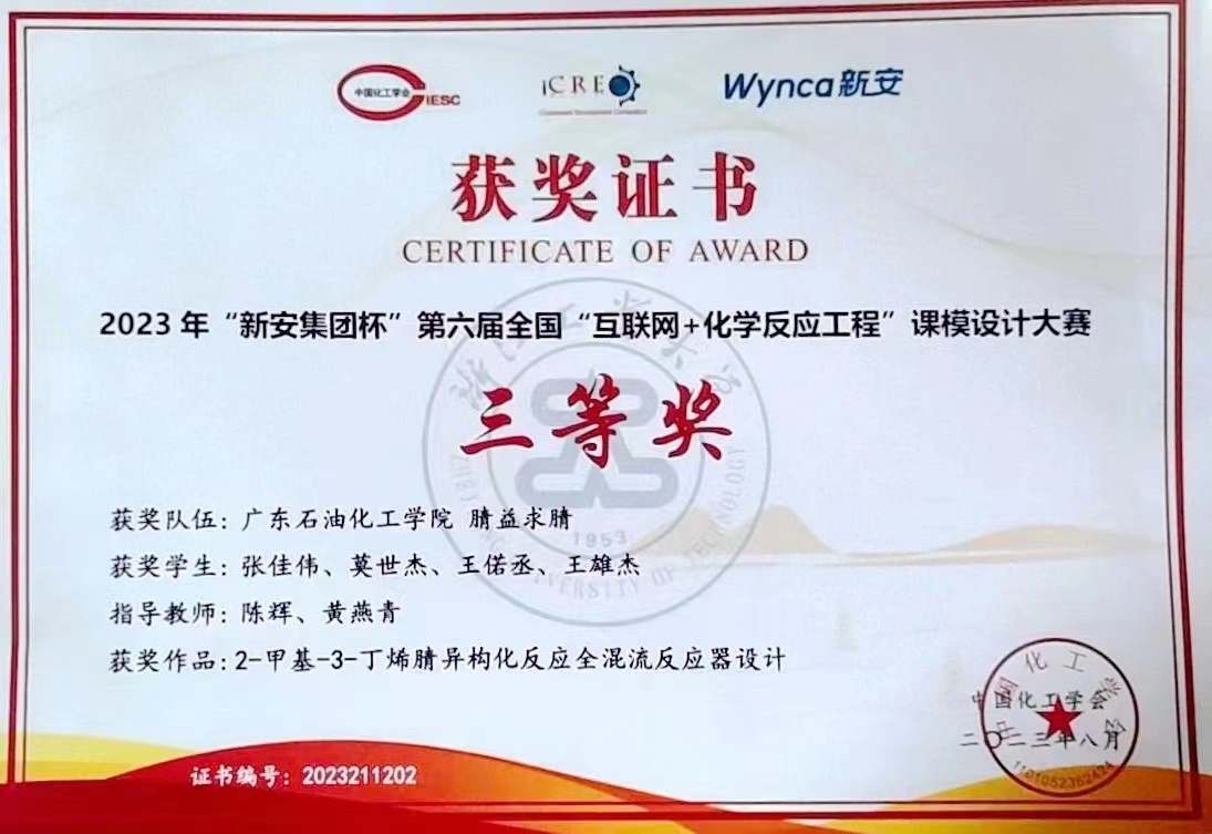 近日,由中国化工协会主办、浙江工业大学承办的2023年“新安集团杯”第六届全国“互联网+化学反应工程”课模设计大赛公布了获奖名单,beat365官方网站代表队“腈益求腈”团队(成员:张佳伟、莫世杰、王偌丞、王雄杰)在陈辉教授和黄燕青老师的指导下荣获全国三等奖。