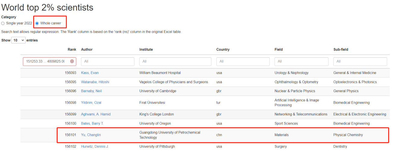 余长林教授入选2023年度全球前2%顶尖科学家榜单