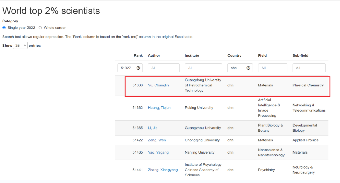 近日,美国斯坦福大学和爱思唯尔数据库(Elsevier Data Repository)发布了第六版《全球前2%顶尖科学家榜单2023》(World’s Top 2% Scientists),根据“生涯影响力”和“年度影响力”遴选出世界排名前2%的科学家。我院余长林教授同时入选2023年全球前2%顶尖科学家“生涯影响力”榜单和2023年全球前2%顶尖科学家“年度影响力”榜单。