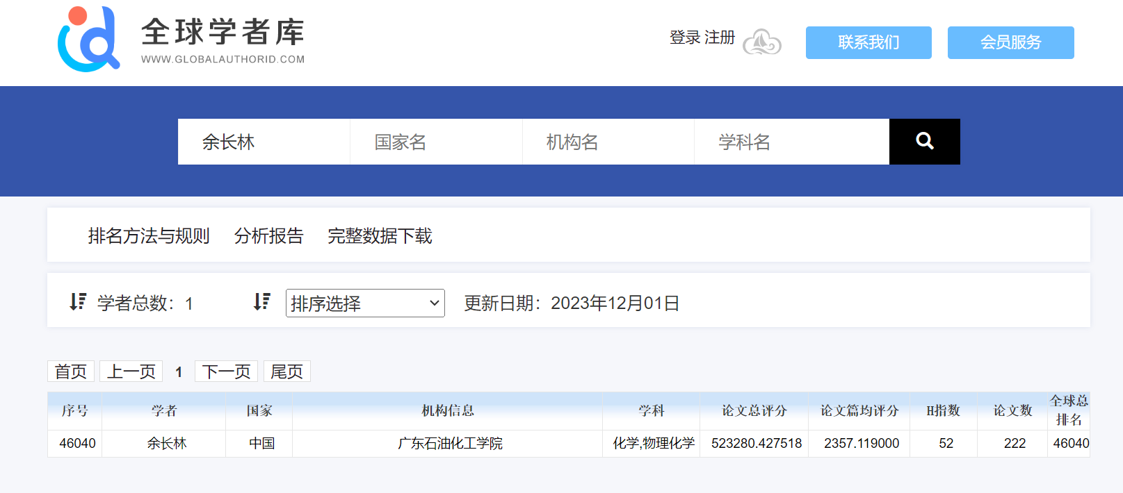 近日,全球学者库网站公布了“2023全球学者学术影响力排名 (终身学术影响力榜)”, 国内共有8029名学者入选,我院余长林教授入选化学学科终身学术影响力榜。
